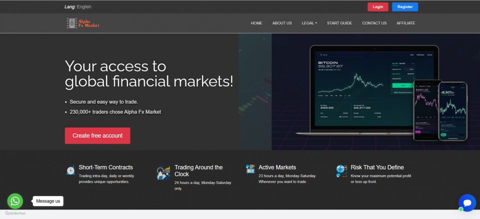 AlphaFXMarket (alphafxmarket.com) presents itself as a trading platform offering access to global financial markets. The website claims over 230,000 traders have chosen their services. They offer various trading options, including short-term contracts and around-the-clock trading. However, it’s essential to verify such claims before investing.