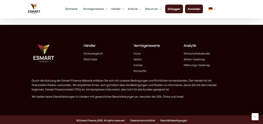 EsmartFinance (esmartfinance.ltd) introduces itself as an international investment and trading company. It claims to provide services in forex, commodities, cryptocurrencies, and stock markets. The broker advertises secure trading, advanced technology, and profitable opportunities for investors. However, the website does not share detailed company history or management information. No information about headquarters or corporate structure is provided. This lack of transparency reduces trust and credibility.