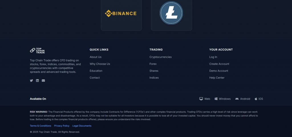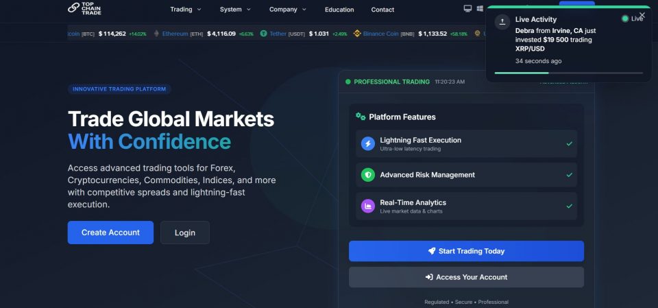 This article offers a detailed Top Chain Trade review of the broker operating via topchaintrade.com. The broker presents itself as a professional trading platform covering options, stocks, crypto, and futures. On its website, the firm claims to be an “award‑winning platform” but gives very limited verifiable history. The broker’s claimed experience and marketing tone appear inconsistent with independent verification.