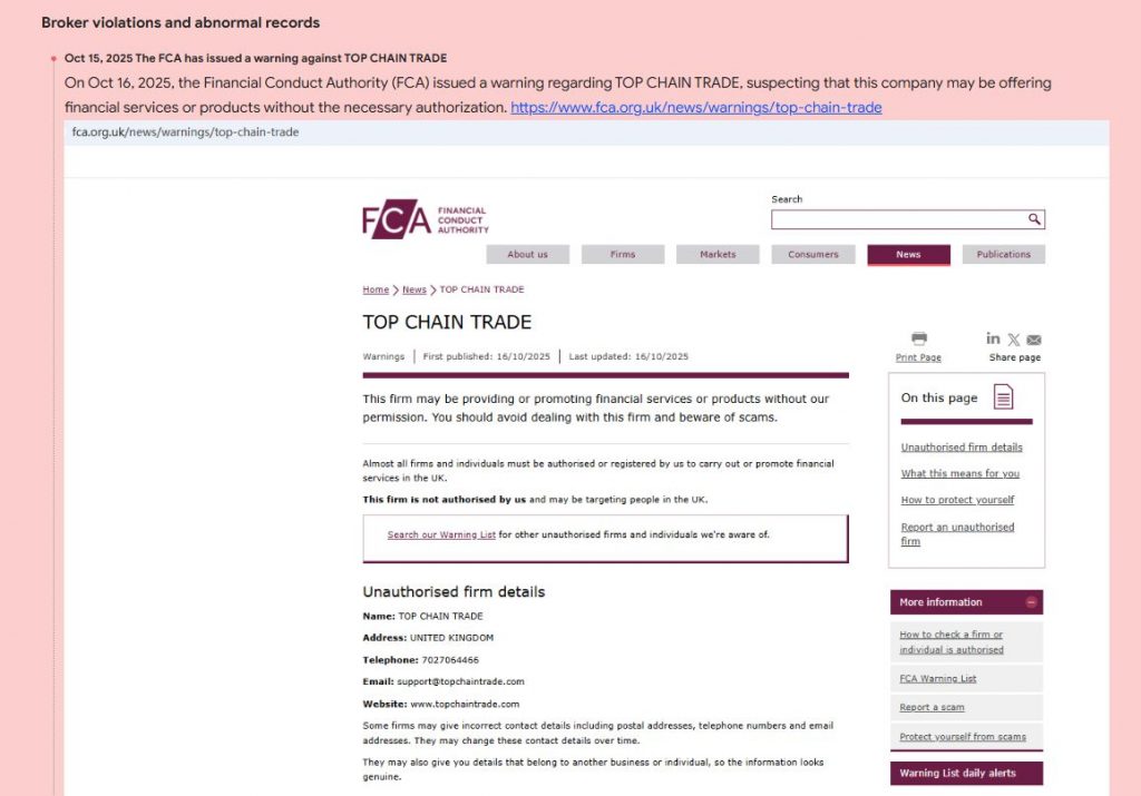 In this Top Chain Trade review, we conclude that the broker is highly unreliable. Key risks include the lack of regulation, the absence of transparent conditions, and promotional incentives that signal aggressive marketing. Legitimate brokers provide verifiable licences, public trading terms, and independent user feedback. None of these are convincingly present here. The fact that the broker has been flagged by financial regulators sharply undermines credibility.