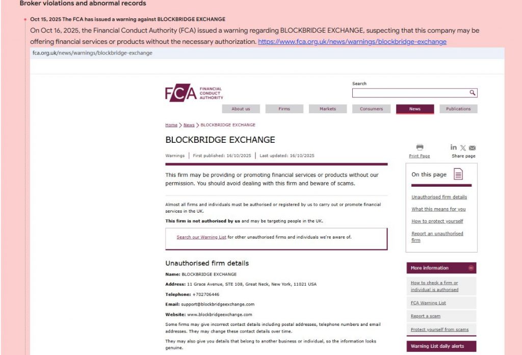 In this BlockBridge Exchange review we examine licensing claims. According to public reports, the broker presents no verifiable licence from major regulators and appears to operate unregulated. A regulatory‑alert site flags the company as lacking valid oversight. This absence of transparent regulation is a serious warning sign for any trader.