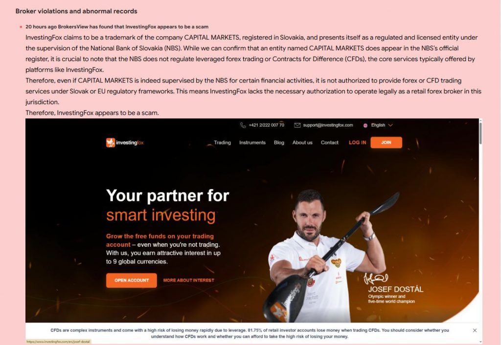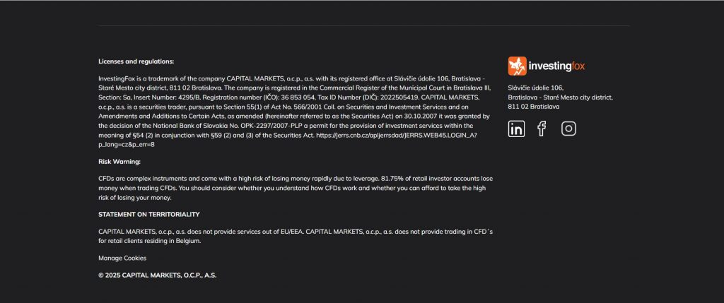 InvestingFox (investingfox.com) says it holds a regulatory license from Slovakia. It mentions being supervised by the National Bank of Slovakia. However, no direct license number or document is shown. There is no license certificate or downloadable proof on the site. Real regulated brokers usually display clear regulatory credentials. The lack of visible documentation raises important questions. Traders cannot verify the license status directly on the platform.