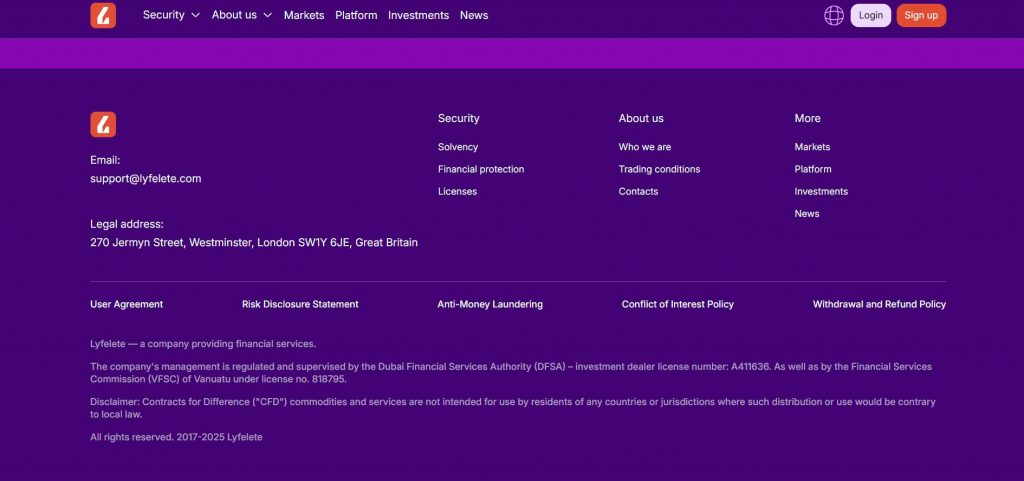 LyfeLete presents itself as a reliable and compliant broker. However, no regulatory license numbers or official certificates are shown on the website. There is no confirmation of authorization from FCA, CySEC, or ASIC. Legitimate brokers always display regulator details for verification. The absence of licensing information is a strong red flag.