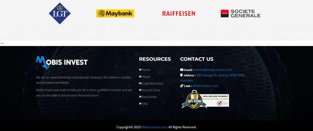 Mobis Invest (mobis‑invest.com) presents itself as a modern investment broker. They claim to offer trading in forex, crypto, stocks, and commodities. The site shows slick design and professional styling. It lists an address at “680 George St, Sydney, Australia.” Yet many important facts about ownership are missing. Domain registration appears recent and not aligned with claims. This gap raises suspicion about their true operations and age.