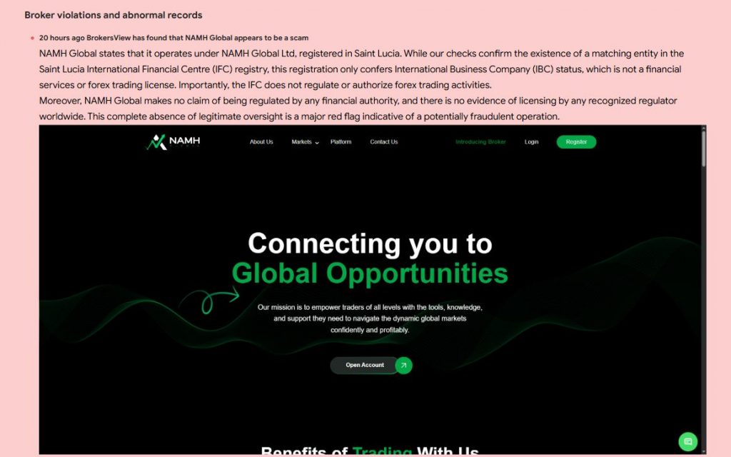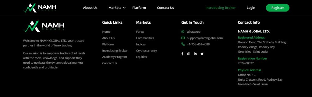 NAMH Global (namhglobal.com) presents itself as a global trading provider. The broker claims to offer access to many financial markets. They list forex, commodities, indices, equities, and cryptocurrencies as available assets. The company also advertises fast execution and simple account setup. However, the website gives very limited corporate information. There is no clear history, team details, or business background. This lack of transparency raises early concerns for many traders.