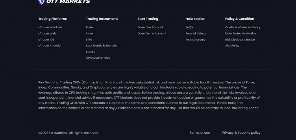 OTT Markets (ottmarkets.com) describes itself as a CFD and forex broker. They claim to offer trading in forex, stocks, indices, crypto, and commodities. The site emphasizes fast execution, tight spreads, and global reach. They state their platform is “designed by traders for traders.” However, essential information about ownership and company history is missing. Their domain registration and public records provide little verification. This lack of transparency starts to raise serious concerns about reliability.