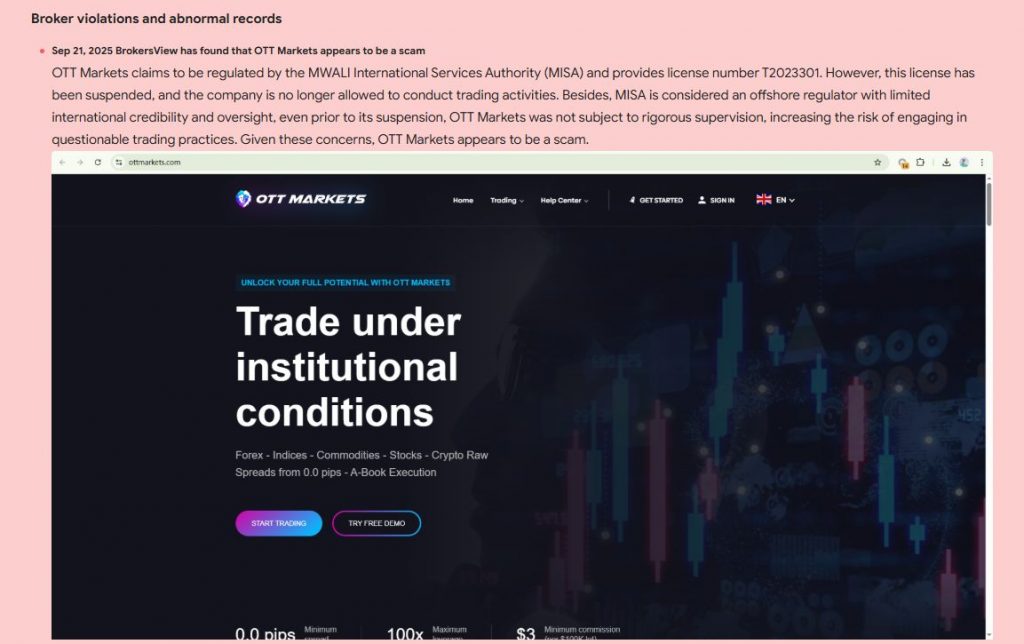 OTT Markets mentions regulatory oversight via MISA (Mwali regulator). However, MISA is an offshore regulator with low international credibility. There is no evidence they hold licenses from top regulators like FCA or ASIC. Independent risk assessments label their regulatory status as weak. Thus, client protections under OTT Markets appear minimal or nonexistent.