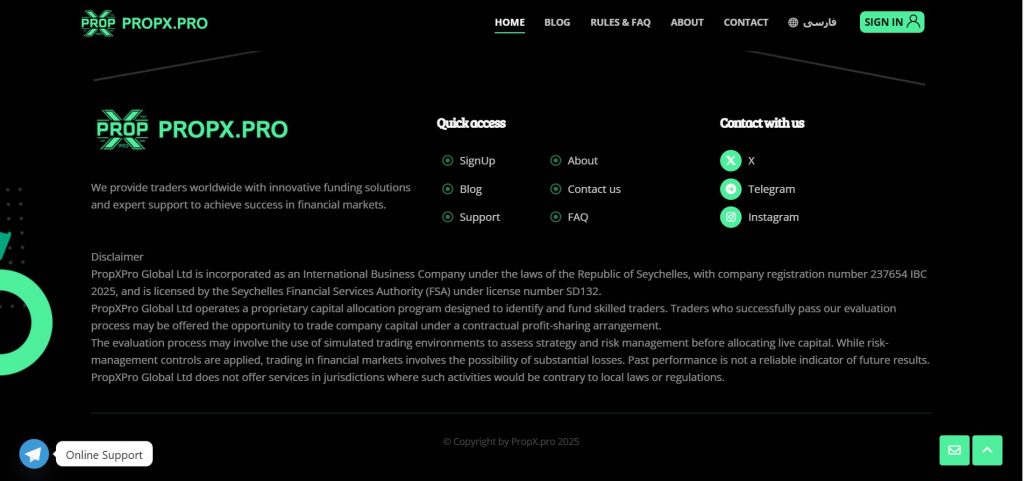 PropX.Pro does not provide any visible regulatory license or oversight information. The website does not list a license number or show registration with a known financial authority. Without clear proof of regulation, there is no guarantee of oversight or client fund protection. This absence of regulation is a serious warning for anyone considering depositing money. Legitimate brokers and prop firms usually publish regulatory credentials and legal transparency. PropX.Pro fails on this basic requirement.