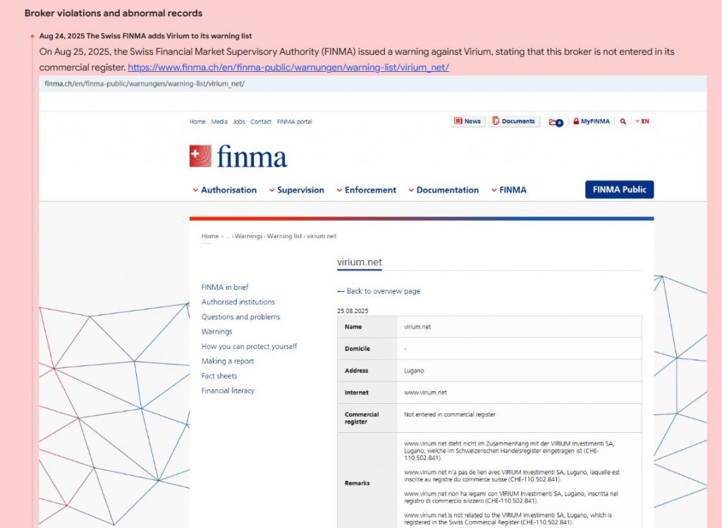 Virium raises severe red flags for investors. Its claim of FINMA regulation is false and countered by warning. Trading costs, deposits, and platform details lack clarity. User feedback confirms recurring issues with withdrawal and trust.