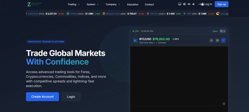 ZenithCore Capitals advertises a proprietary web-based trading platform.